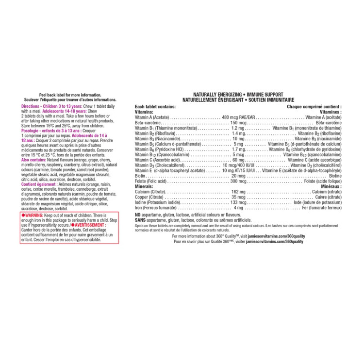 مولتی ویتامین کودکان جمیسون 60 عدد Jamieson Kids Chewable Multi با تامین ویتامینها و مواد معدنی ضروری در قالبی خوشمزه و جذاب، به رشد و سلامت کلی کودکان کمک میکند و مصرف آن را برای کودکان آسان و لذتبخش میسازد.