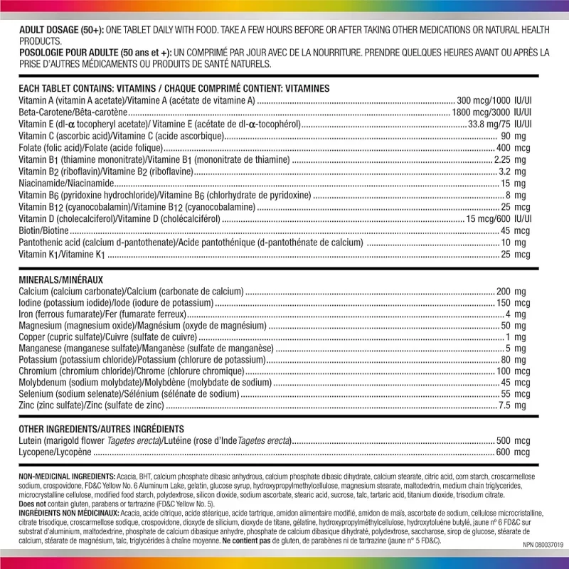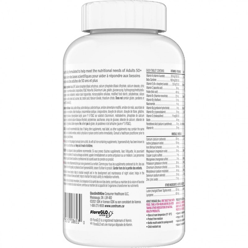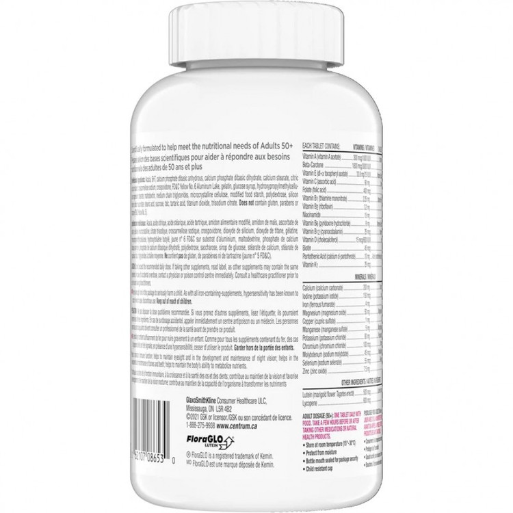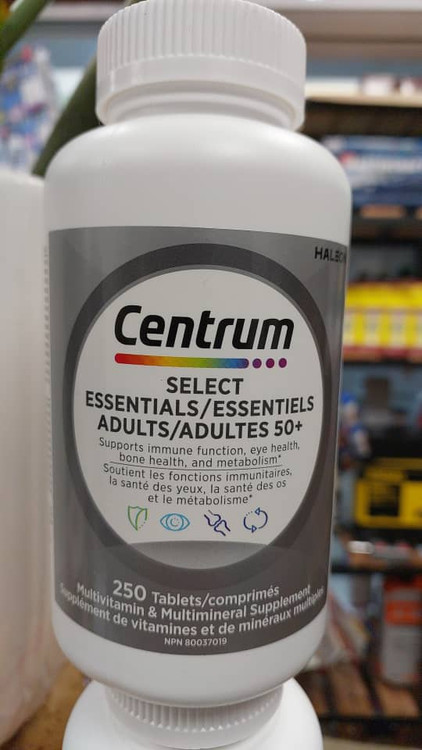 نیازهای تغذیه ای روزانه برای بزرگسالان 50+: مولتی ویتامین Centrum Select Essentials 50+ که با تعادل ویتامین ها و مواد معدنی برای بزرگسالان بالای 50 سال فرموله شده است، حاوی روی، سلنیوم، کروم، ویتامین K1 و لیکوپن برای رفع نیازهای تغذیه ای افراد بالای 50 سال است.