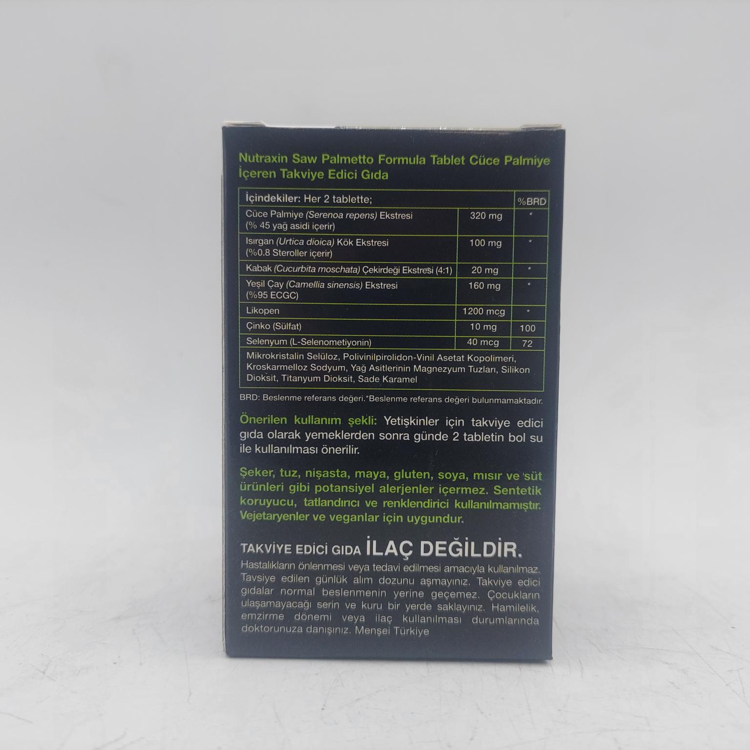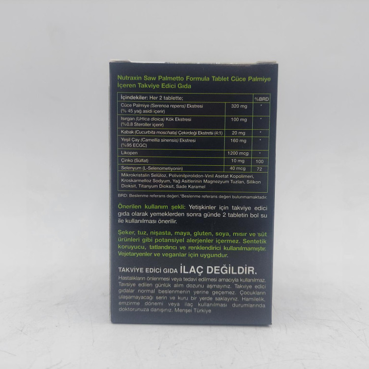 ساوپالمتو فورمولا نوتراکسین Nutraxin Saw Plametto Formula حاوی عصاره نخل اره است. این مکمل حاوی مواد معدنی و لیکوپن به همراه گزنه، دانه کدو تنبل، چای سبز است. لیکوپن رنگدانه ای از خانواده کاراتونیدها است که به گوجه فرنگی رنگ قرمز می دهد.