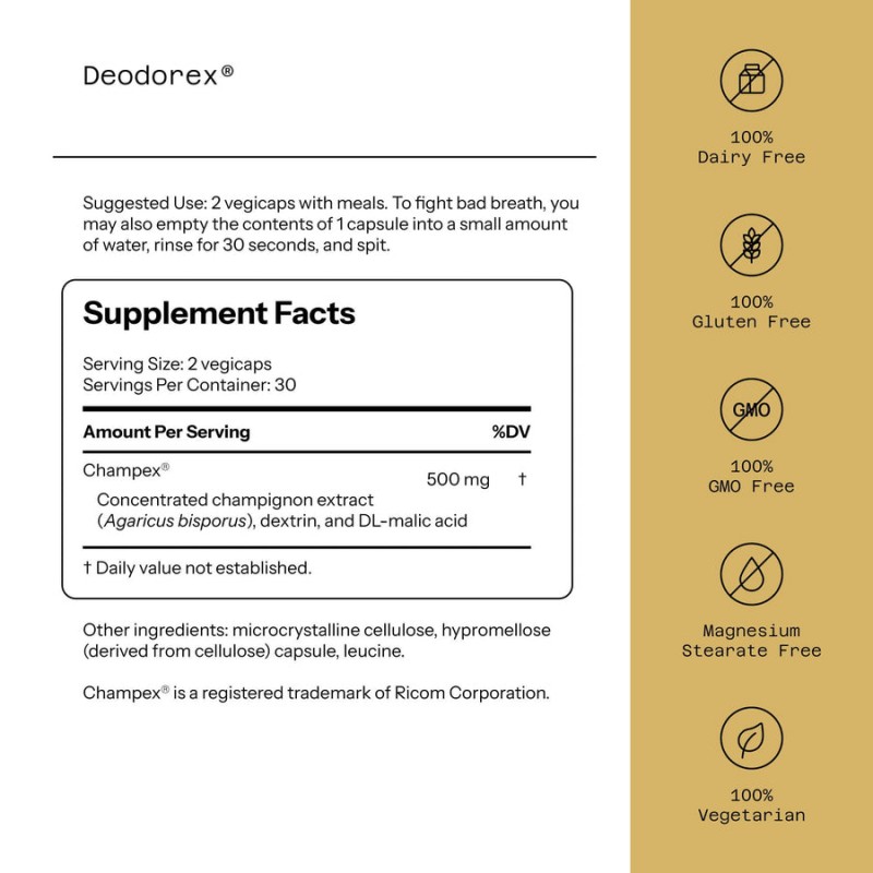 قارچ شامپینیون همچنین به عنوان قارچ دکمه ای سفید رایج (Agaricus bisporos) شناخته می شود. Champex®، یک عصاره انحصاری و اختصاصی شامپینیون، به گونه ای متمرکز شده است که حاوی طیف گسترده ای از ترکیبات مبارزه با بو، از جمله اسیدهای آمینه، پلی فنول ها و پلی ساکاریدها باشد.* موادی مانند آمونیاک، ایندول، مرکاپتان، سولفات هیدروژن و آمین را خنثی یا جذب می کند که هنگام تجزیه پروتئین در روده و خون تولید می شوند.