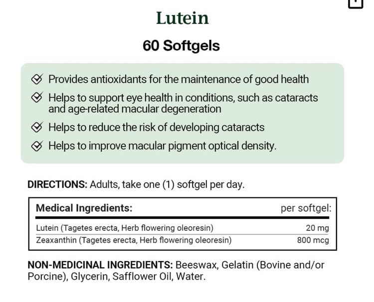 از نظر بالینی برای بینایی سالم ثابت شده است. لوتئین در سلامت چشم نقش دارد. نرم ژل مایع برای بلع آسان.