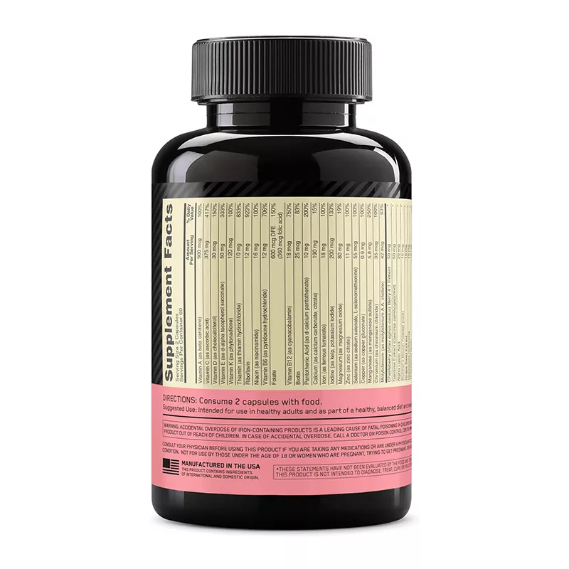 مکمل مولتیویتامین “Opti-Women” از شرکت Optimum Nutrition است. مولتی ویتامین اپتی ومن اپتیموم (Optimum Nutrition Opti-Women Multivitamin) به طور خاص برای نیازهای تغذیهای بانوان طراحی شده و شامل ترکیبی از ویتامینها، مواد معدنی و ترکیبات گیاهی مفید است. مولتی ویتامین بانوان Opti-Women اپتیموم (ON Opti-Women Multivitamin) یک انتخاب عالی برای بانوانی است که به دنبال یک مکمل جامع برای حمایت از سلامت عمومی، بهبود انرژی و تقویت سیستم ایمنی هستند. هر بسته مولتی ویتامین Opti Women بانوان حاوی ۶۰ کپسول است که برای ۳۰ روز مصرف طراحی شده (۲ کپسول در روز) و دارای ترکیباتی از ۲۳ نوع ویتامین و مواد معدنی ضروری و گیاهی میباشد.