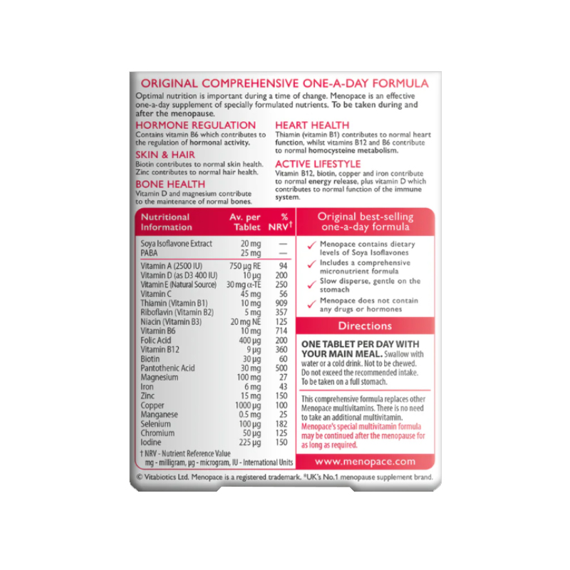 منوپیس اورجینال ویتابیوتیکس Vitabiotics Menopace Orginal،همیشه دوران قاعدگی برای اگر بانوان همراه با درد و گرفتگی بوده اما دیگر با مصرف این مکمل از درد و عذاب قاعدگی برای همیشه خلاص شوید،منوپیس اورجینال ویتابیوتیکس سبب حفظ و تعادل ریز مغذی های خاص مناسب دوران یائسگی در بدن می شود، این محصول یک فرمول متعادل و دقیق و جامع شامل ۲۱ ریزمغذی ضروری به همراه ایزوفلان های سویا بوده که علاوه بر رفع علایم و نشانه های یائسگی سبب بهبود ساخت کلاژن پوست، حفظ استحکام و سلامت استخوان ها می شود.