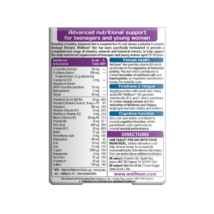 مولتی ویتامین دختر ول هر ویتابیوتیکس Vitabiotics Wellteen Her، جوانان امروزی بیش از هر زمان دیگری با زندگی اجتماعی شلوغ، آخر شب و صبح زود، مطالعه و ورزش، باید بیشتر از قبل زندگی کنند، اطمینان از یک رژیم غذایی سالم و متعادل ضروری است، اما همیشه در یک سبک زندگی پرمشغله نوجوانان اولویت ندارد، Wellteen Her مخصوصاً برای نوجوانان و زنان جوان 13 تا 19 ساله ساخته شده است و طیف گسترده ای از ویتامین ها، مواد معدنی را برای کمک به حمایت از نیازهای تغذیه ای روزانه به اضافه Co-Q10، ال-کارنیتین، دانه انگور و عصاره کرن بری فراهم می کند، مصرف بهینه مواد مغذی در دوران نوجوانی و جوانی می تواند زمینه را برای سلامت مادام العمر فراهم کند، نوجوانان برای اطمینان از رشد سالم در طول جهش رشد باید ویتامین ها و مواد معدنی کافی داشته باشند، به علاوه با تغییرات فیزیکی و بیوشیمیایی قابل توجهی در بدن خود، نیاز به مواد مغذی به شدت افزایش می یابد، سال های نوجوانی شاید از نظر تغییرات هورمونی و البته استرس عاطفی مهم ترین باشد.