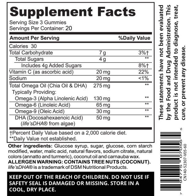 محصول آمریکا- تقویت سیستم مغزی بهبود عملکرد سیستم عصبی حاوی امگا3،6،9 حاوی سدیم، ویتامین سی، روغن نارگیل و DHA بدون مواد مصنوعی مضر فاقد گلوتن دارای گواهی تاییدیه FDA،NSF, GMP مناسب زنان و مردان پاستیلهای طعم دار لیمویی و پرتقالی