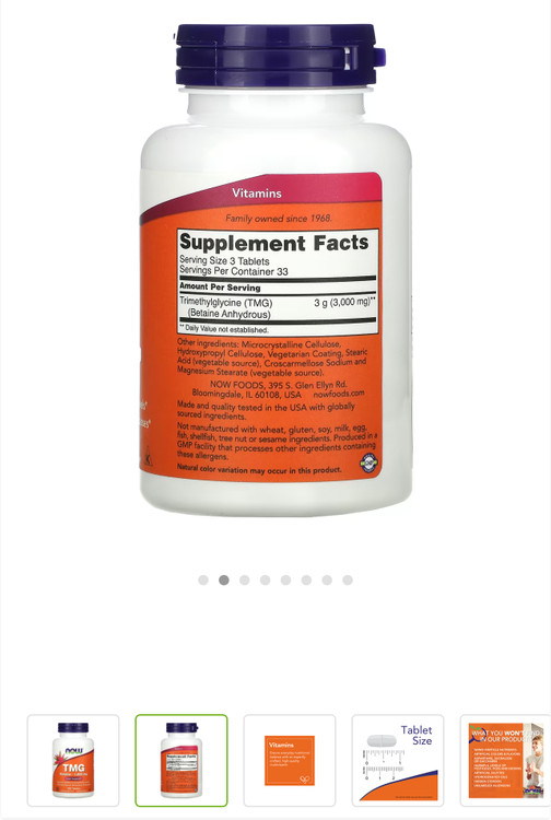 Now Foods، TMG (Trimethylglycine)، 1000 میلی گرم، 100 قرص گیاهی، بتائین