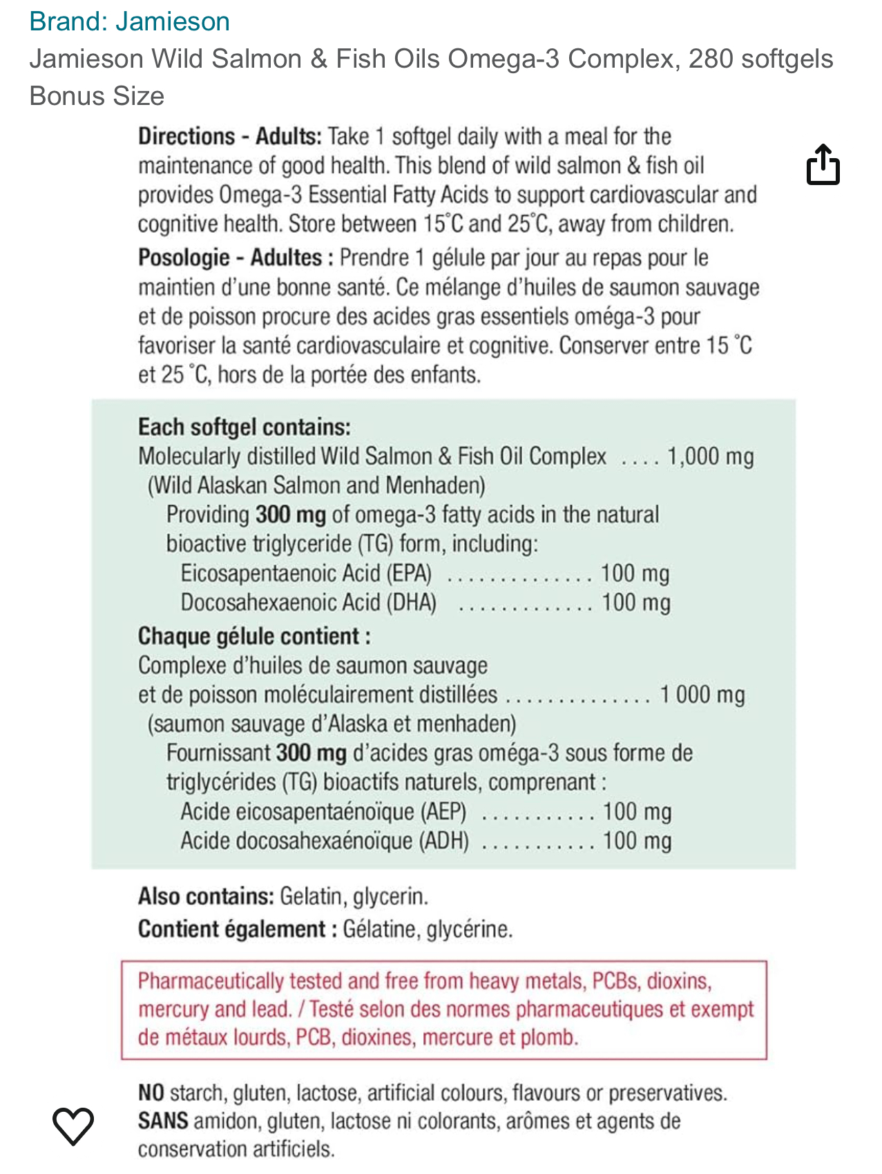 هر نرم ژل حاوی: ماهی آزاد و روغن ماهی وحشی تقطیر شده مولکولی 1000 میلی گرم (سالمون وحشی آلاسکا و منهادن) ارائه 300 میلی گرم اسیدهای چرب امگا 3 به شکل طبیعی و بیواکتیو تری گلیسیرید (TG) شامل: ایکوزاپنتانوئیک اسید (EPA) اسید (DHA) 100 میلی گرم