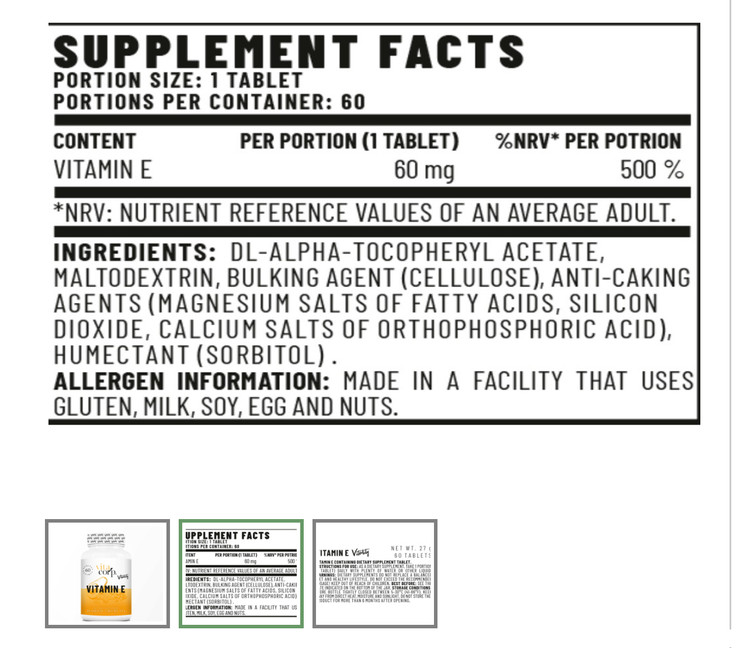 DL-آلفا-توکوفریل استات، مالتودکسترین، عامل حجیم (سلولز)، عوامل ضد انباشتگی (نمک های منیزیم اسیدهای چرب، دی اکسید سیلیکون، نمک های تشکیل شده با اسید اورتوفسفریک کلسیم)، مرطوب کننده (Sorbit).