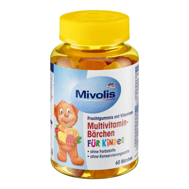 خرس های مولتی ویتامین کودکان Mivolis با طعم میوه های خوشمزه است. خرس های مولتی ویتامین حاوی ویتامین های B1، B2، B6، B12، C و E، اسید پانتوتنیک، بیوتین و نیاسین است.