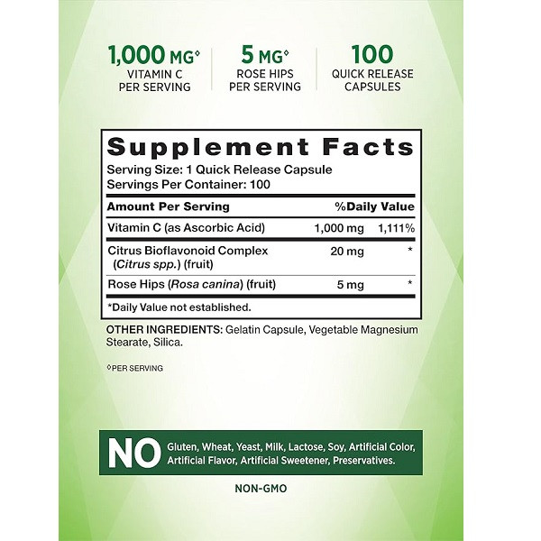 این کپسول ها برای ارائه 1000 میلی گرم ویتامین C به اضافه 20 میلی گرم کمپلکس بیوفلاونوئید مرکبات و 5 میلی گرم رز سرخ، دو ماده شناخته شده با خواص آنتی اکسیدانی طبیعی، برای پشتیبانی بیشتر فرموله شده اند. فقط یک کپسول در روز نیاز دارید تا مقدار توصیه ویتامین C روزانه خود را دریافت کنید.