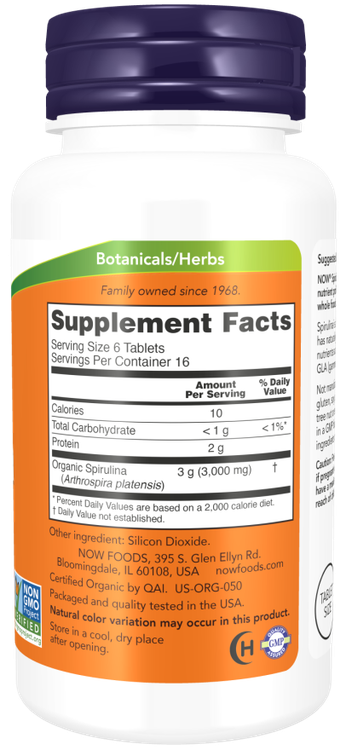 اسپیرولینا ناو 500 میلی گرم 200 عدد NOW Spirulina مشخصات مواد مغذی طبیعی موجود در غذاهای کامل را ارائه می دهد. اسپیرولینا یک ریزجلبک سبز آبی است که دارای پروتئین طبیعی و سایر مواد مغذی مانند ویتامین ها، مواد معدنی و GLA (گاما-لینولنیک اسید) است. قرص های اسپیرولینا ارگانیک تایید شده ناو خالص هستند و فاقد مواد کمکی یا افزودنی هستند.