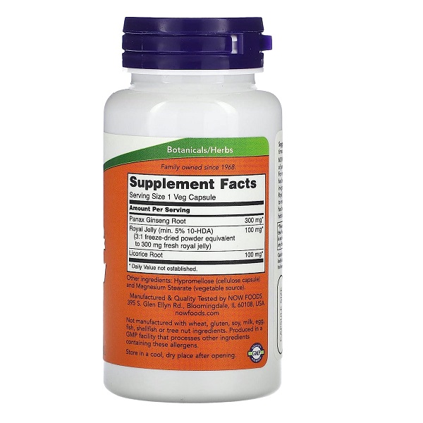 جینسینگ و رویال ژل ناوNOW Ginseng & Royal Jelly ترکیبی از جینسینگ Panax Ginseng، ژل رویال و ریشه شیرین بیان است. بیش از 2000 سال است که Panax Ginseng توسط گیاهپزشکان چینی به دلیل خواص تقویتکننده، آداپتوژنیک و مقوی آن مورد توجه بوده است. ژل رویال غذای خاصی است که توسط زنبورهای عسل برای رفع نیازهای منحصر به فرد ملکه تولید می شود. قرن هاست که به عنوان یک غذای لذیذ و توسط گیاهپزشکان سنتی استفاده می شود.