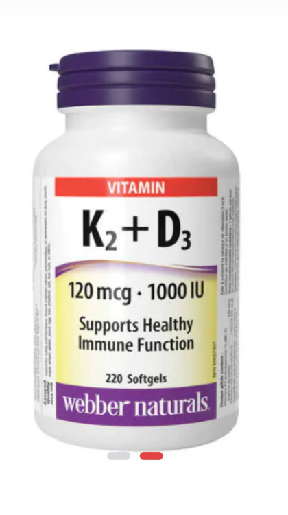 ویتامین K2+D3 از Webber Naturals دارای مناکینون، فرم فعال بیولوژیکی MK-7 ویتامین K، با ویتامین D3 (کوله کلسیفرول) برای حمایت از عملکرد سیستم ایمنی و کمک به ساخت استخوانها و دندانهای قوی است.