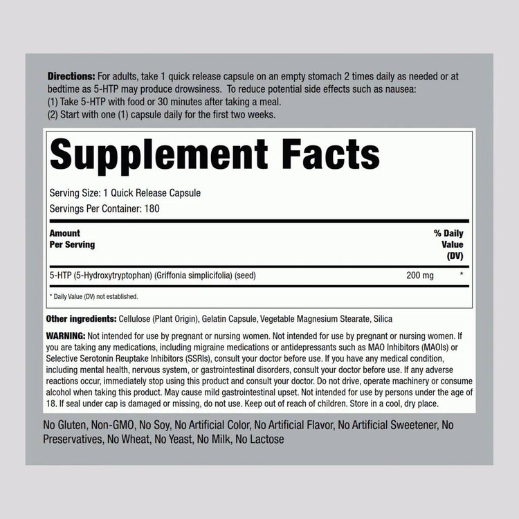 - هر کپسول این محصول حاوی 200 میلیگرم 5-HTP است که میتواند دوز موثری برای کمک به بهبود خلقوخو و خواب باشد.
