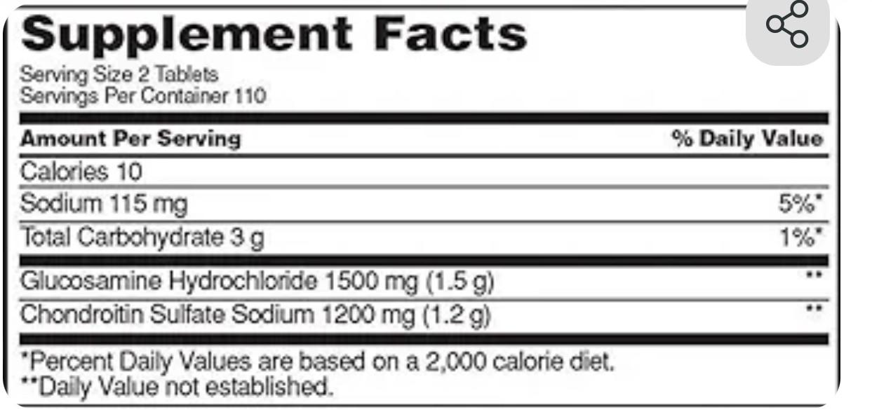 مواد تشکیل دهنده در هر وعده از دو (2) قرص: کالری 10 - سدیم 115 میلی گرم - کربوهیدرات کل 3 گرم - گلوکوزامین HCI 1500 میلی گرم - کندرویتین سولفات سدیم (گاو) 1200 میلی گرم. سایر مواد لازم: Croscarmellose سدیم، سلولز میکرو کریستالی، دی اکسید سیلیکون، اسید استئاریک، استئارات منیزیم، هیدروکسی پروپیل متیل سلولز، سدیم لوریل سولفات، طعم وانیل مصنوعی، پلی اتیلن گلیکول، موم کارنوبا. ممکن است حاوی تری گلیسیرید زنجیره متوسط، تری استین باشد.